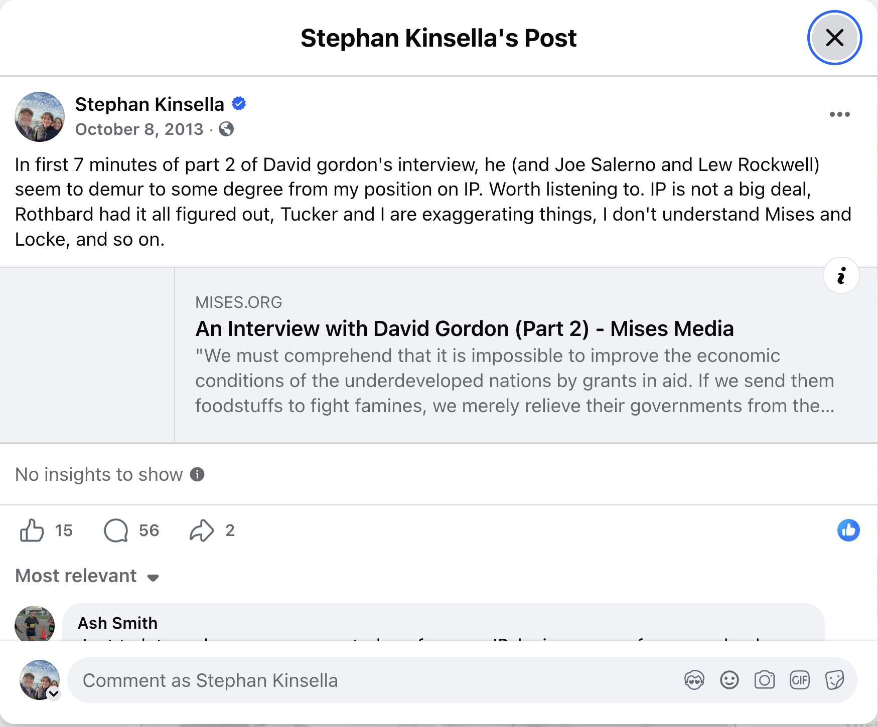 So against this backdrop, I was flabbergasted that they chose to spend 7 minutes criticizing me and my IP and related ideas in the 2 hour two-part Rothbard entry in the Oral History Project. I quoted their words in a Facebook post (see screenshot above). (I think Gordon is confused about some of this or perhaps has some weird axe to grind, I don’t know; perhaps more on this in a later article. For now, see David Gordon on IP and Locke, Smith, Marx; the Labor Theory of Property and the Labor Theory of Value; and Rothbard, Gordon, and Intellectual Property.)