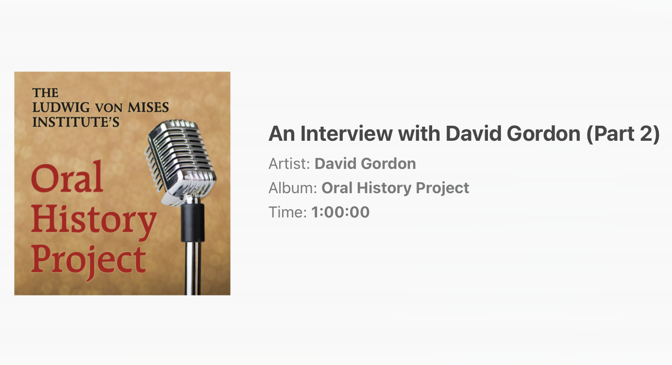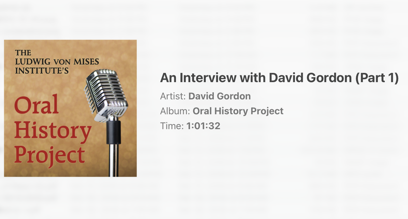 And then the murky powers-that-be at MI instantly deleted the podcast. I figured they would scrub the first 7 minutes and re-post it; after all, it was not about me and contained some good material. But … no. They just deleted it and let it disappear. And since their site was then and since then has been in chaos, it was nowhere to be found, not even on archive.org. I thought it was sad that this oral history of Rothbard had been lost. I believed this for the last 12 years. However, just recently someone noticed a post of mine mentioning this and apparently has better archive.org-fu than I, because he found Part 2, and that clue allowed me to find Part 2. So: here is the archived information I was able to find: archived MI page, which linked to “Oral History Project >> An Interview with David Gordon (Part 2)” (Oct. 04, 2013) and “Oral History Project >> An Interview with David Gordon (Part 1)” (Oct. 04, 2013). As for the MP3 files: see MP3 file for Part 1; MP3 file for Part 2.