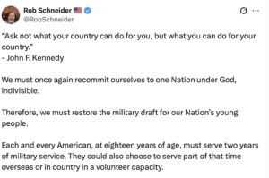 Briefly, Scheider is now promoting (non-ironically) the idea of reinstating the draft in the US (a sadly “new” idea re-emerging). Upon publishing his unsolicited opinion he received a tidal wave of backlash (or “ratio” in X-posting parlance). He soon doubled down to “explain” it was meant to be a legal instrument to de-incentivize politicians from sending other kids off to war if they know their own children might get called up. The most charitable interpretation of this stance is that he is incredibly naïve, not only about politics but likewise American history (e.g. the recent wars where there has been no congressional approval of military incursions along with well-publicized Vietnam era draft dodging by politically connected youth).