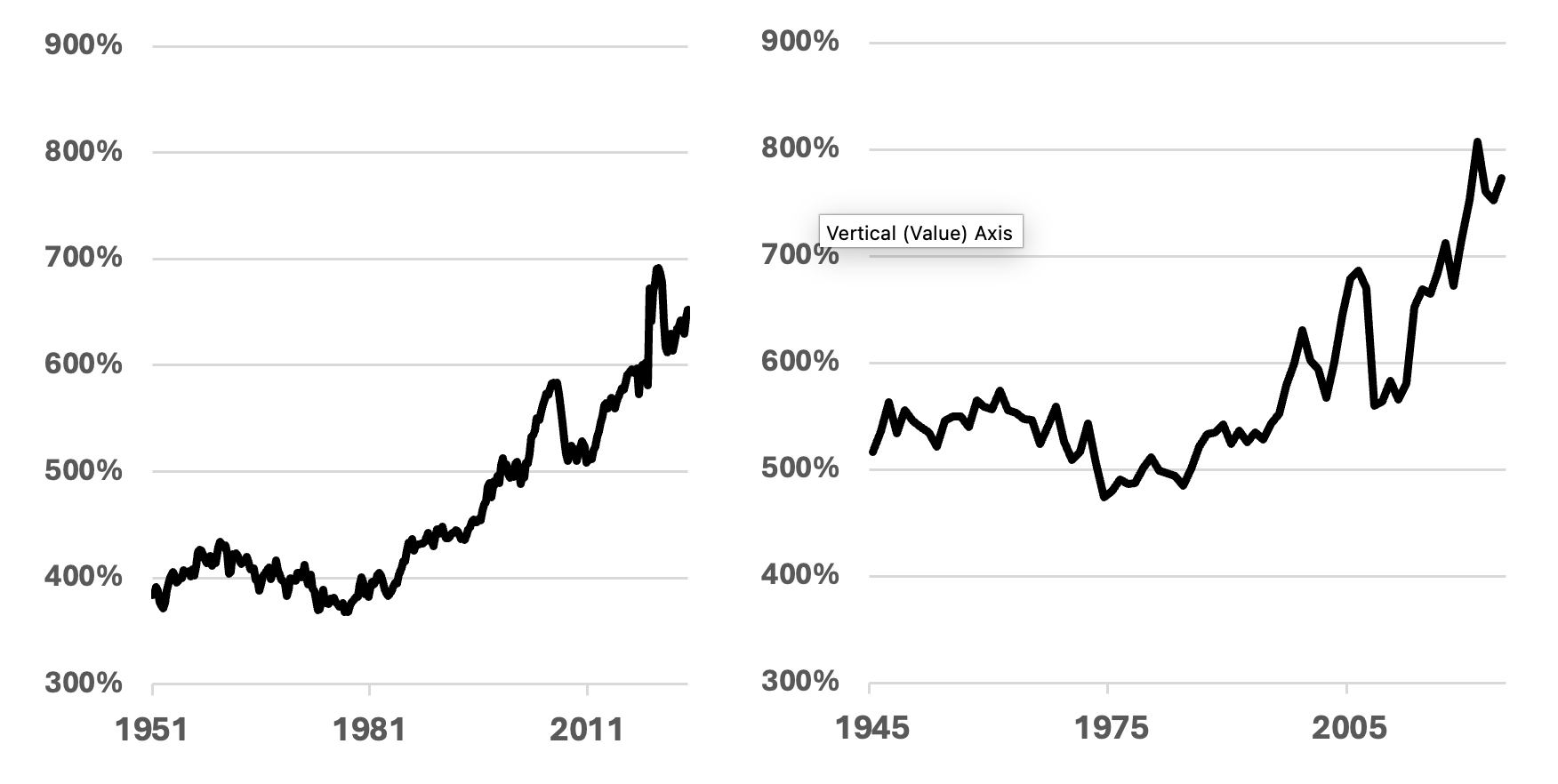 The left panel on Figure 1, below, features the value of all assets held by US household relative to GDP from 1951 to 2025. The right panel features the ratio of the net worth of US households relative to their disposable personal income from 1945 through 2024. Both metrics show that during the first three decades after WWII, the wealth-to-income ratio was more or less stagnant. After the collapse of the Bretton Woods System, the ratio started to increase, very slowly at first and then strongly as from the mid-1980s. This tendency was interrupted here and there by financial crises. But the general trend is intact to the present day.